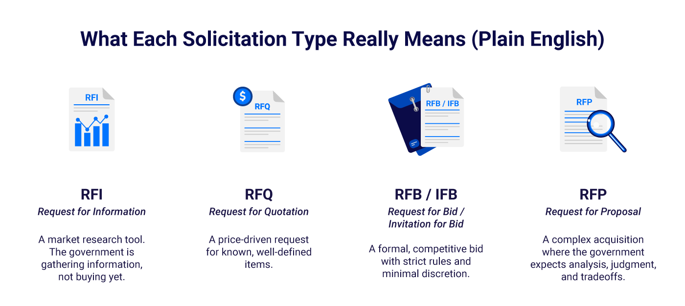 Government procurement is governed by process discipline, not marketing language. Each solicitation type signals where the agency is in its buying decision and how your response will be evaluated.