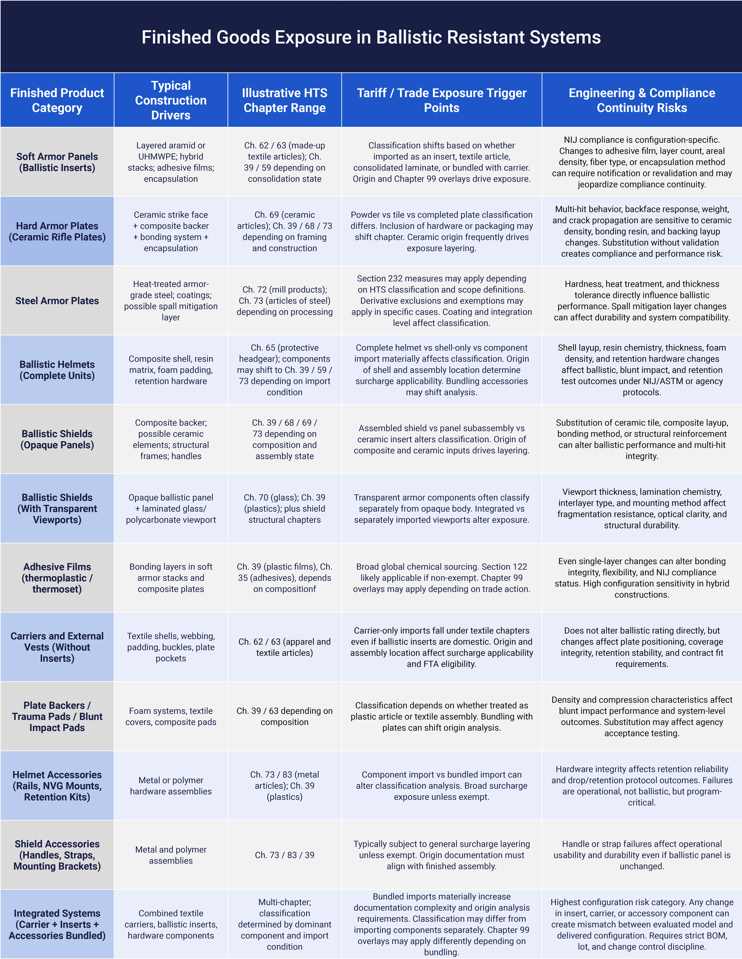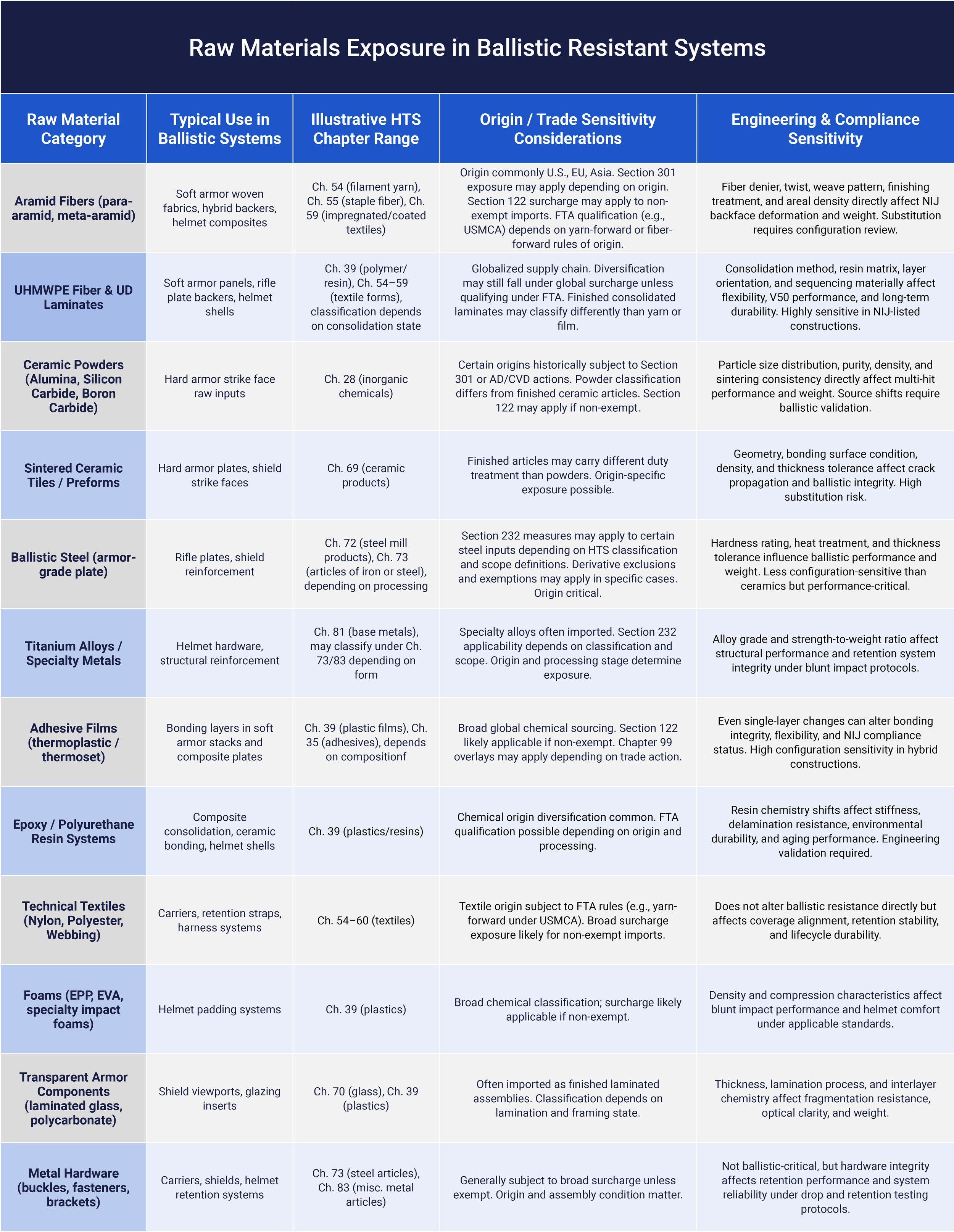 Tariffs do not apply to “armor” in the abstract. They apply to specific inputs under specific Harmonized Tariff Schedule classifications, tied to country-of-origin determinations and entry documentation. When those classifications or rates shift, the effects show up immediately in landed cost, sourcing decisions, bid pricing, lead times, and substitution pressure inside the supply chain.