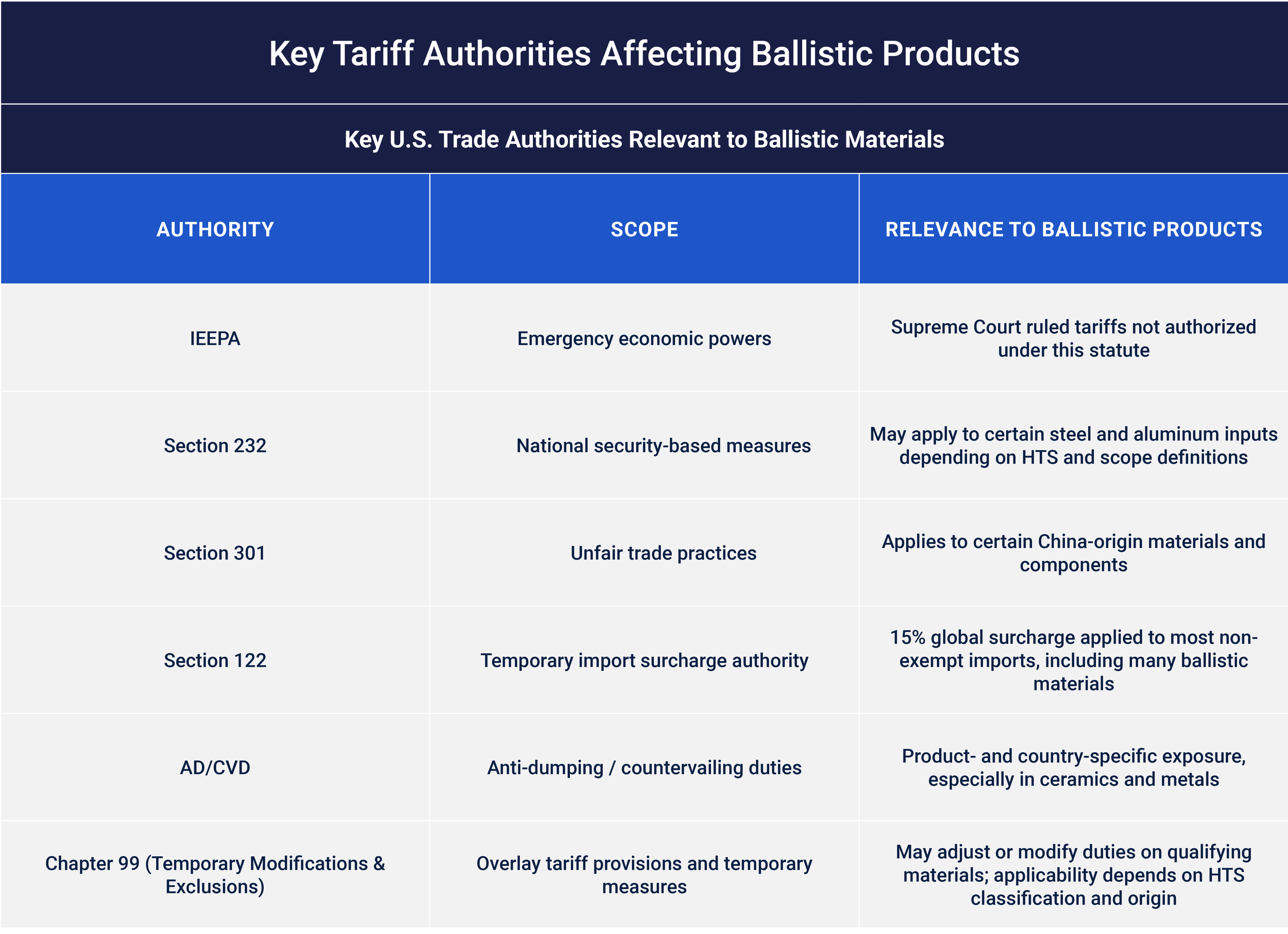 The immediate use of Section 122 authority following the ruling demonstrated how quickly tariff mechanisms can shift. For the ballistic protection sector, the lesson is straightforward: the statutory hook may change, but exposure can persist.