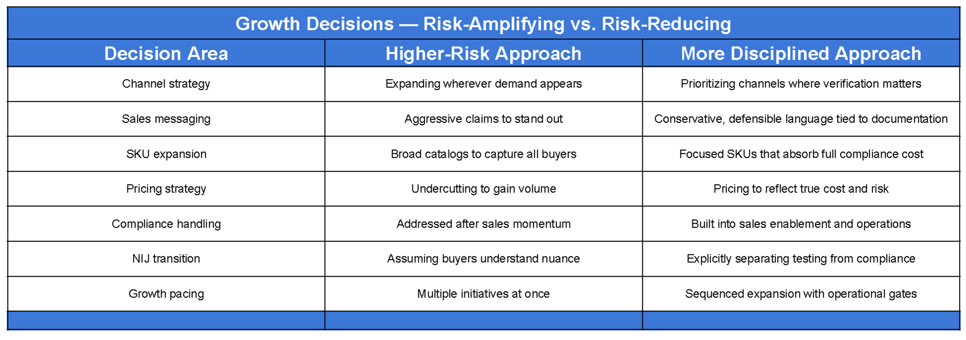 Compliance costs, NIJ testing, documentation control, audits, and corrective actions do not scale well for smaller production volumes. During regulatory transitions, these costs usually increase, not decrease.