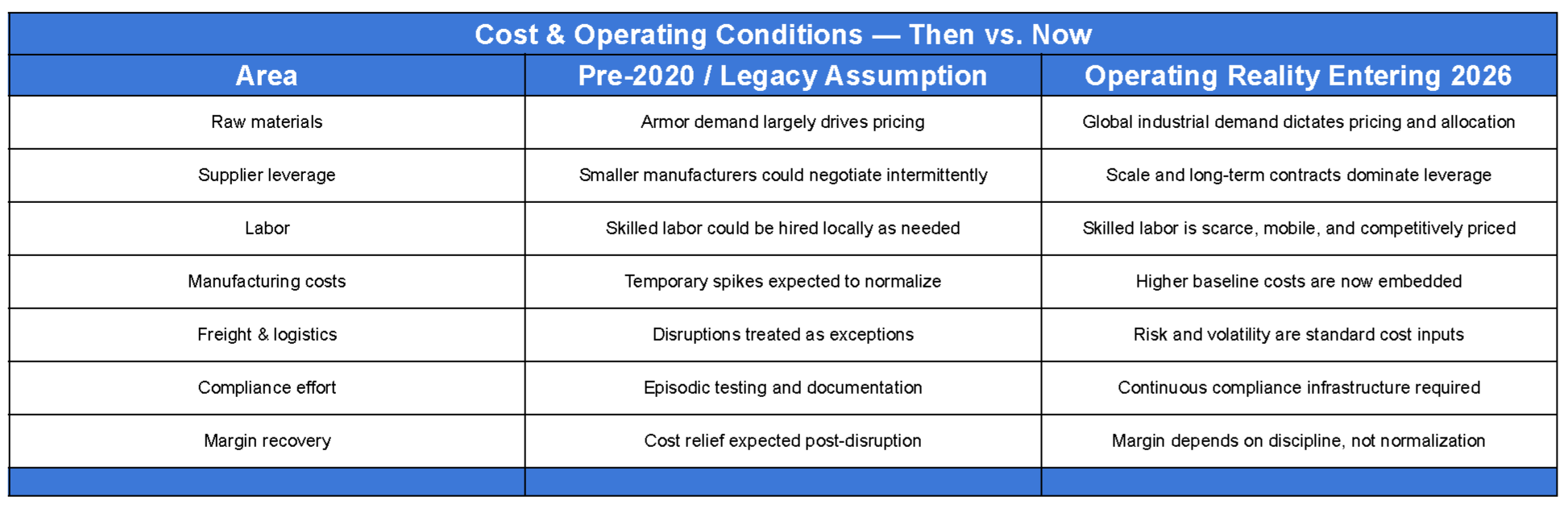 Manufacturers can no longer rely on assumptions that costs will fall back to prior levels, that misleading competitors will fade out on their own, or that compliance ambiguity can be managed informally. Advisory firms like IntelAlytic, which focus on armor compliance, procurement, and risk analysis, have consistently noted that manufacturers entering 2026 are operating in a market where discipline, verification, and operational maturity matter more than speed or volume.